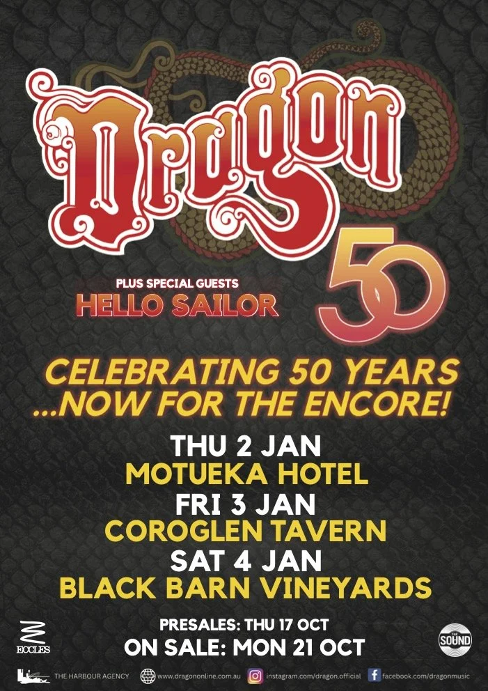 Dragon The Encore Tour will begin on Thursday 2 January at The Motueka Hotel followed by Friday 3 January at The Coroglen Tavern before one final stop at Black Barn Vineyards Havelock North on Saturday 4 January.